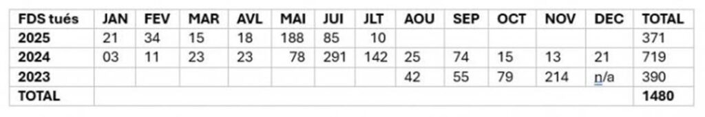 Le tableau ci-dessous récapitule la situation des incidents qui ont visé les forces de sécurité pour la période de juillet 2023 à juillet 2025, soit les deux années de dictature militaire. On observe qu’au cours de ces deux années, 1480 militaires ont été tués lors d’attaques terroristes. [3]